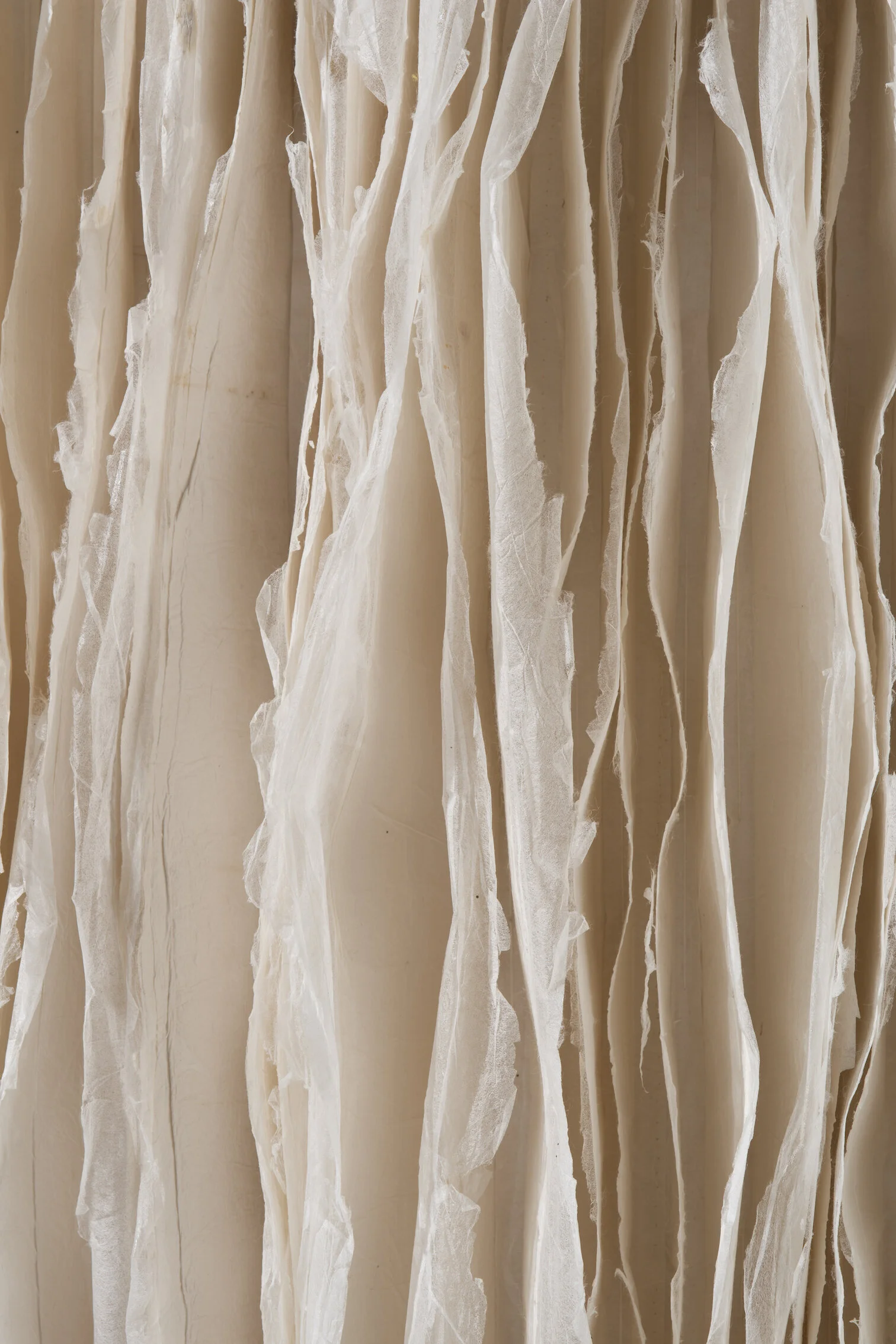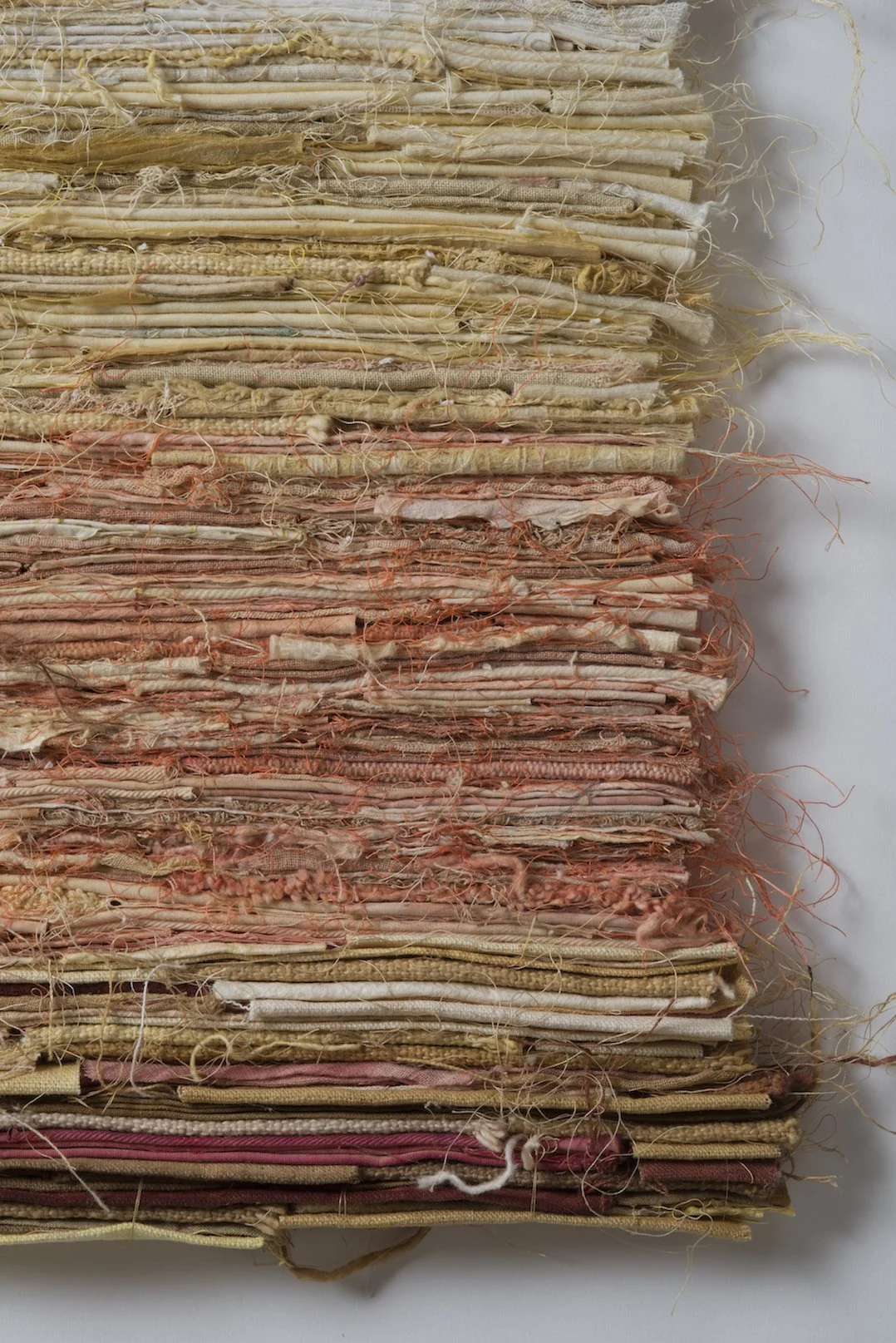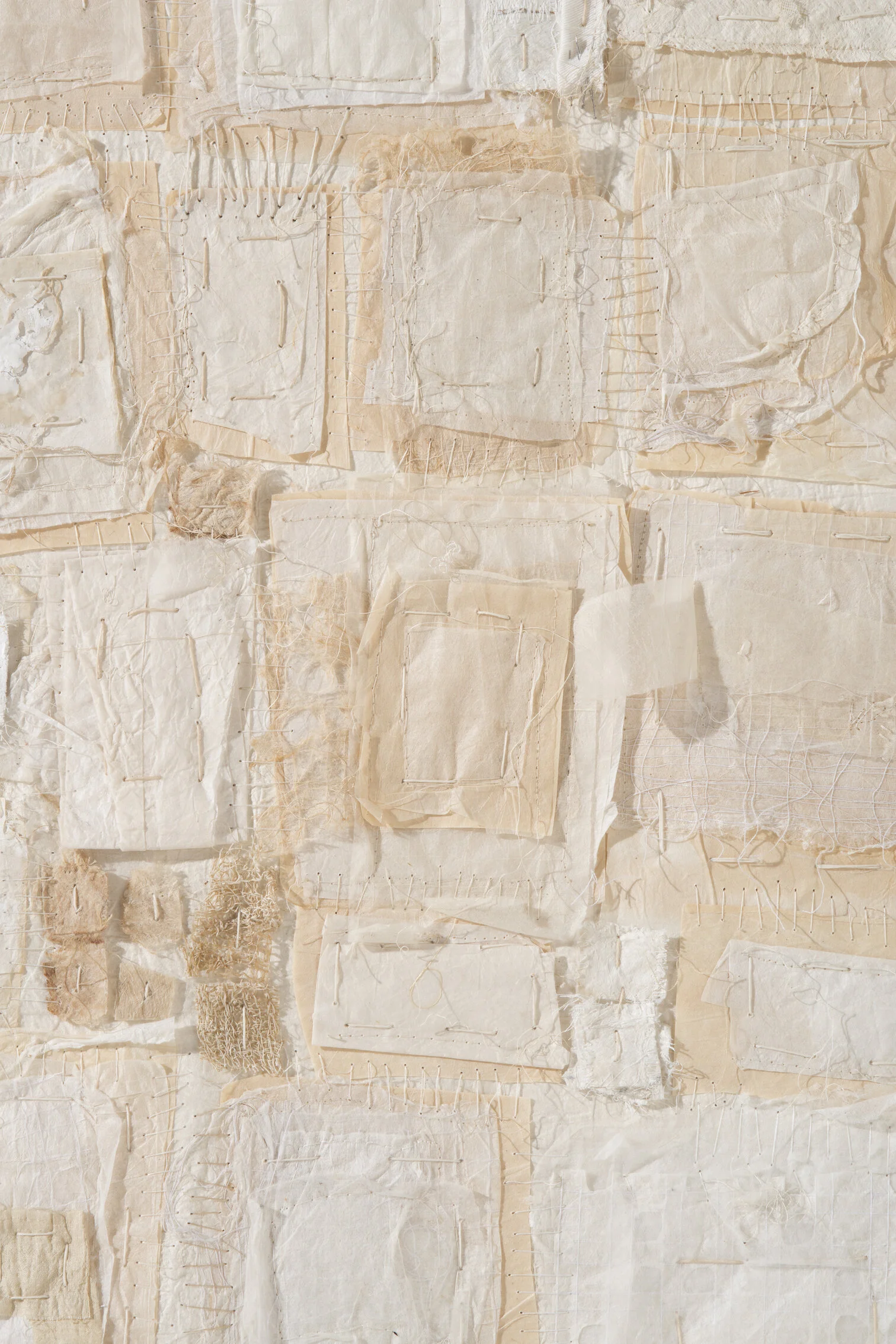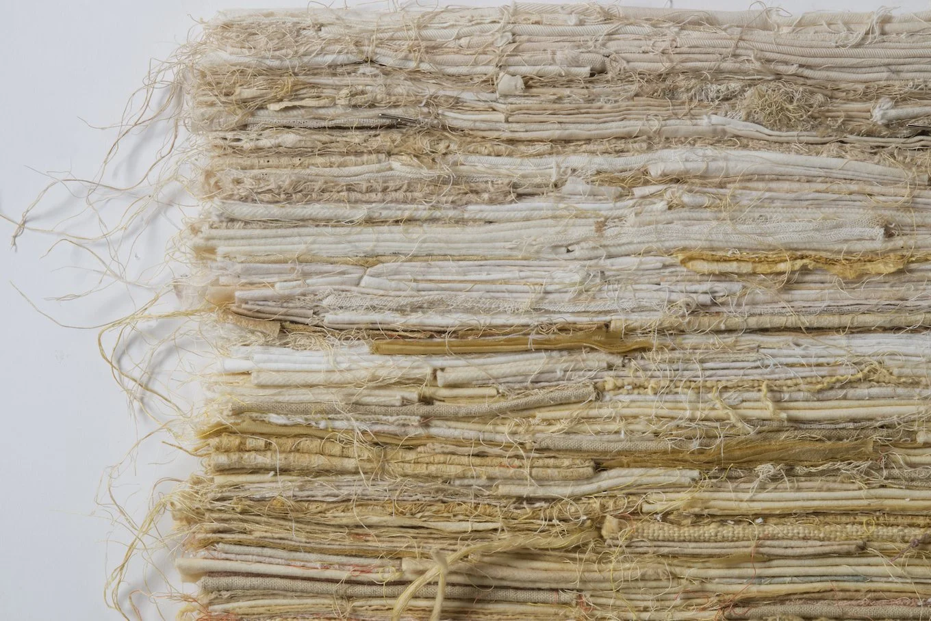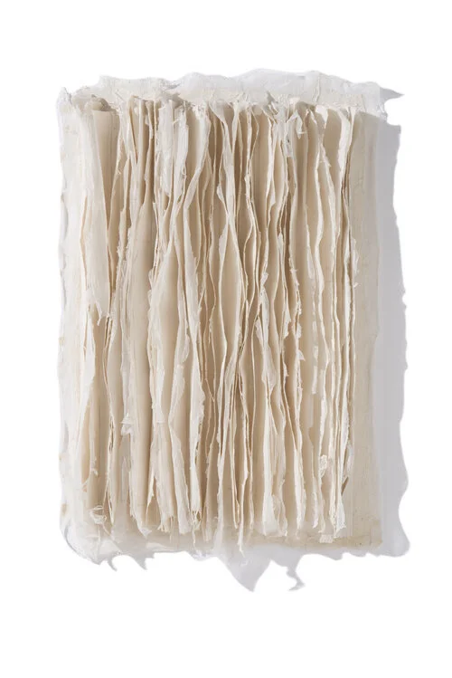 Up-cycled: Stacked, Stitched, and Sewn: Using recovered house and studio material waste, I work with lines, as a window in to the imagination. In essence I see a visual library in the worn stacked paper and used cloth, that is void of written text, yet rich in a language, made sense by our physical touch. These materials trigger memories of a time when the land’s imprint on our lives was more commonplace and when materials, including cloth, was an integral part of our daily lives. Harvesting materials in the environment fostered a connection between our lives and our reliance on plant and earth-based materials, where the influence of the hand’s touch surrounded us. I also use a traditional Korean method, involving hand-stressing with water, that turns paper in to a stronger more durable cloth-like material.